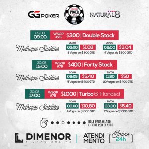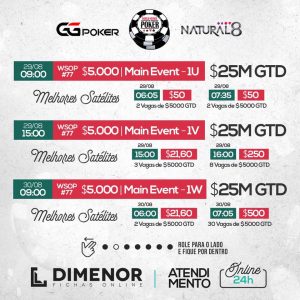 Na Natural8/GGpoker, vai rolar as últimas classificatórias para o Main Event da WSOP e o dia 2 no domingo, e mais 3 eventos valendo bracelete, com buy-ins de $300 no sábado, e de $400 e $1k no Domingo.